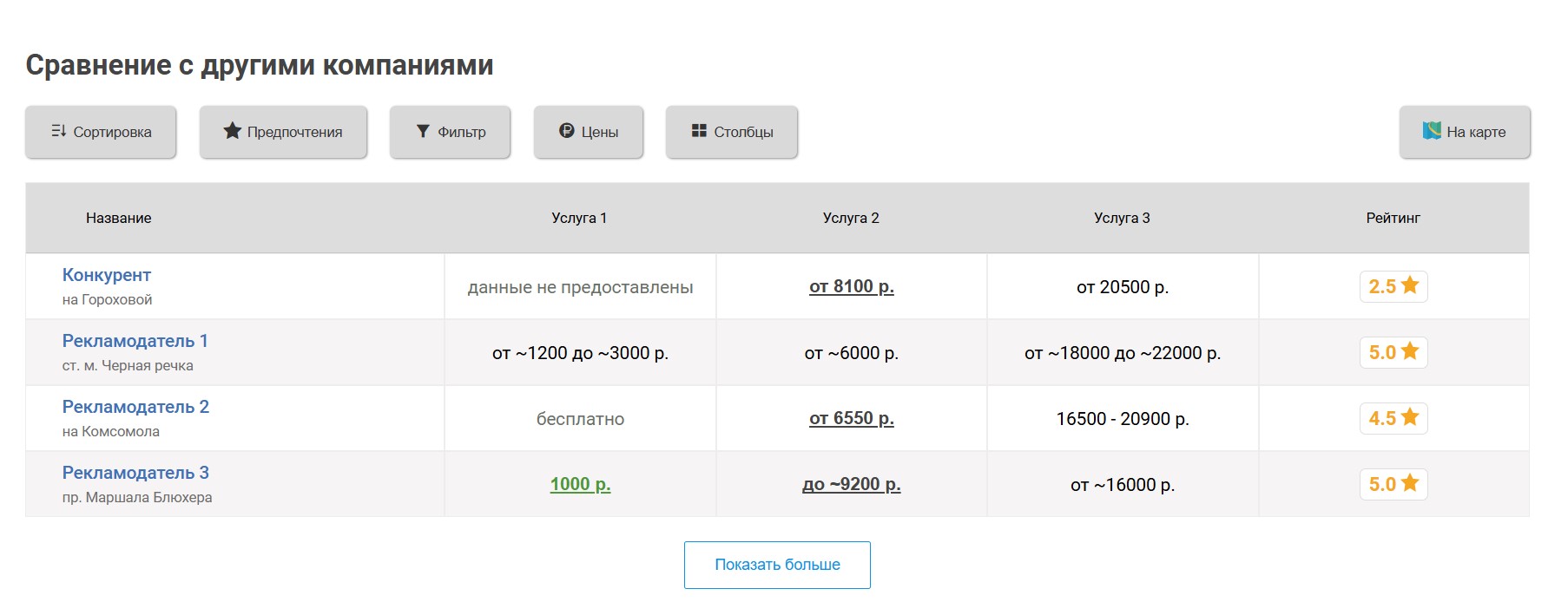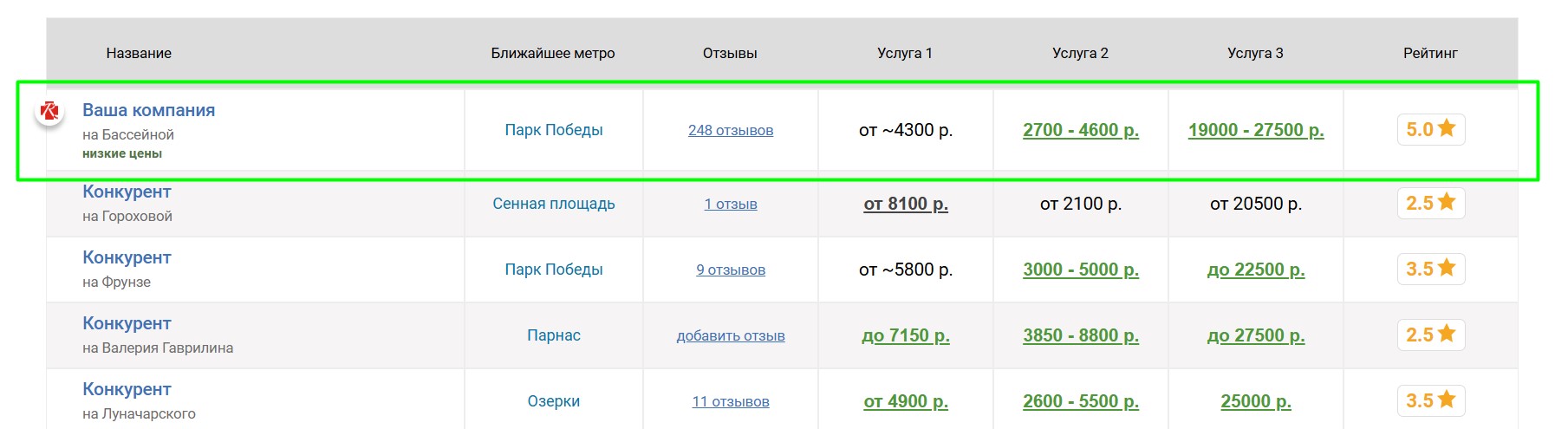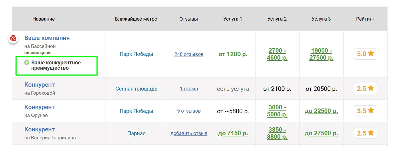 Вокруг продвигаемого таким образом салона выбирается некоторое количество ближайших конкурирующих салонов, продвигаемый салон попадёт к ним в таблицу «Сравнение по ценам», которая выглядит следующим образом:
